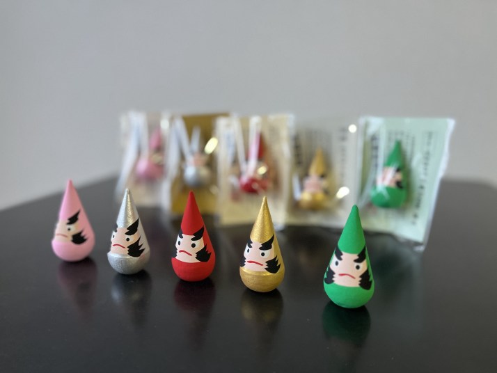 新潟三角達磨 風水 各¥550 金 銀 緑 桃 (赤を合わせると全5色) 金運 健康運 愛情運 など 高さ 約6cm (黒台は展示用です) |