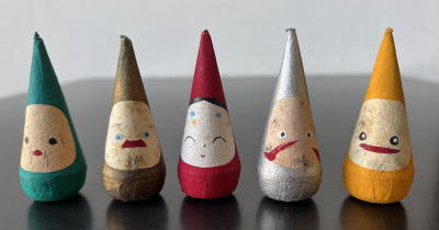 | 出典:「にいがたの郷土玩具」川口栄三 (昭和50年) 三角達磨は 左から、 新潟(みなと人形)・水原(今井氏起上り小法師)・加茂・今町・水原(今井氏) 今町、加茂のだるまは胡粉を盛り上げて鼻に見立てていた |