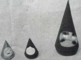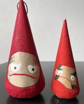 | 三条の三角だるま 「百余年前(1830年代)の発祥といわれる三条の土人形、三角だるま、等は 約30年前(明治35年頃)の昔に廃絶。」 |